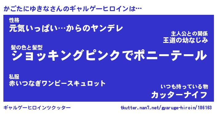 | 女子向けラノベタイトル風あだ名 | 『(仮)かごたにゆきなのやんごとなき事情』 |