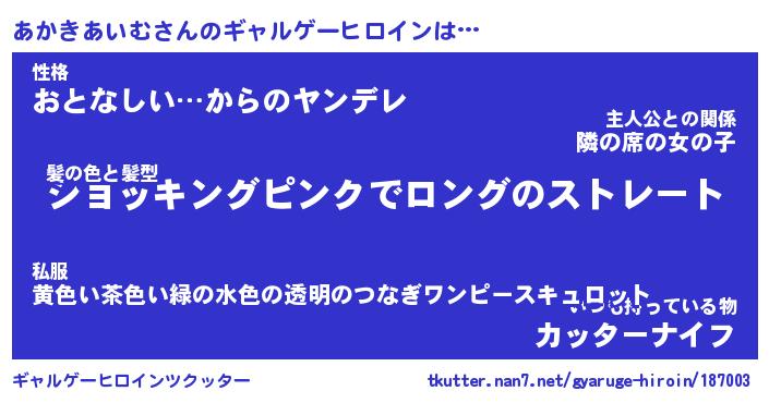| 男性向けラノベタイトル風あだ名 | 『あかきあいむの憂鬱』 |