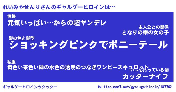 | 男性向けラノベタイトル風あだ名 | 『れいみやせんりの憂鬱』 |