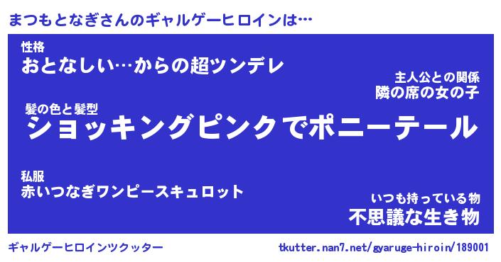 | 男性向けラノベタイトル風あだ名 | 『まつもとなぎの憂鬱』 |