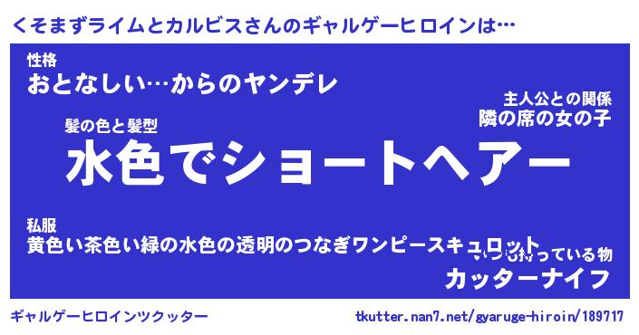 | 女子向けラノベタイトル風あだ名 | 『(仮)くそまずライムとカルビスのやんごとなき事情』 |