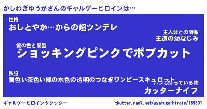| 男性向けラノベタイトル風あだ名 | 『かしわぎゆうかの憂鬱』 |