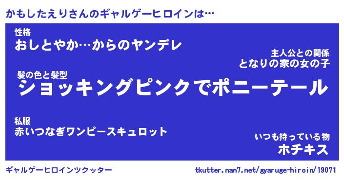 | 伝説のあだ名 | 『伝説の竜騎士かもしたえり』 |