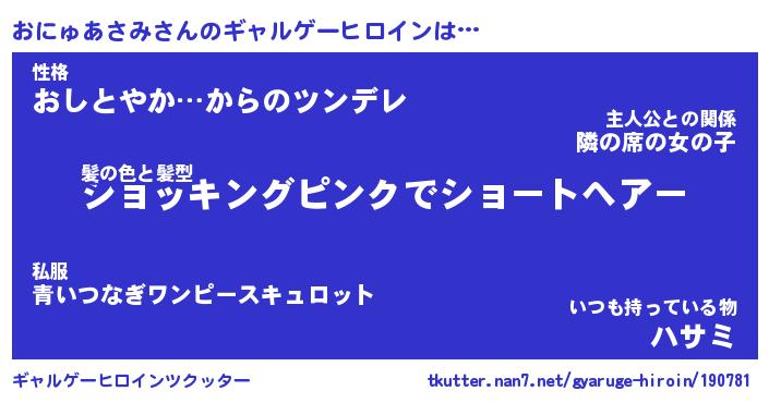 | 女子向けラノベタイトル風あだ名 | 『(仮)おにゅあさみのやんごとなき事情』 |