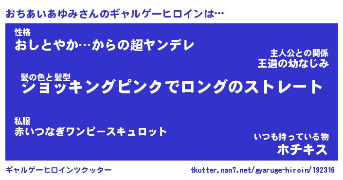 | 女子向けラノベタイトル風あだ名 | 『(仮)おちあいあゆみのやんごとなき事情』 |