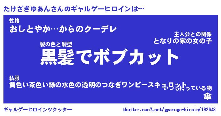 | 男性向けラノベタイトル風あだ名 | 『たけざきゆあんの憂鬱』 |