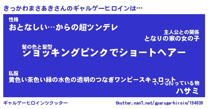 | 女子向けラノベタイトル風あだ名 | 『(仮)きっかわまさあきのやんごとなき事情』 |