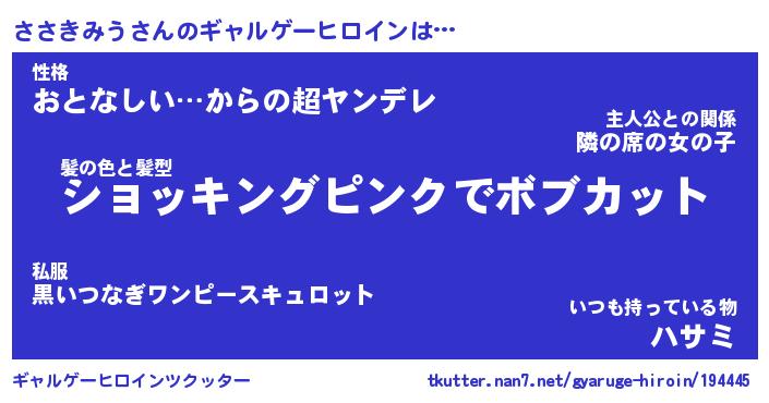 | 女子向けラノベタイトル風あだ名 | 『(仮)ささきみうのやんごとなき事情』 |