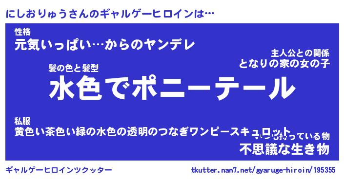 | 男性向けラノベタイトル風あだ名 | 『にしおりゅうの憂鬱』 |