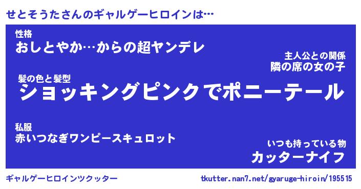 | 男性向けラノベタイトル風あだ名 | 『せとそうたの憂鬱』 |