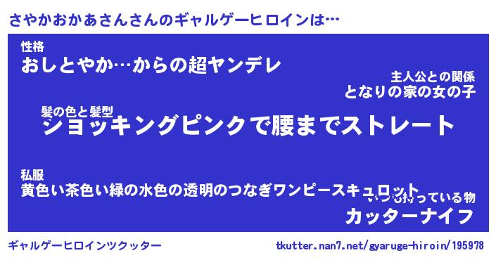 | 女子向けラノベタイトル風あだ名 | 『(仮)さやかおかあさんのやんごとなき事情』 |
