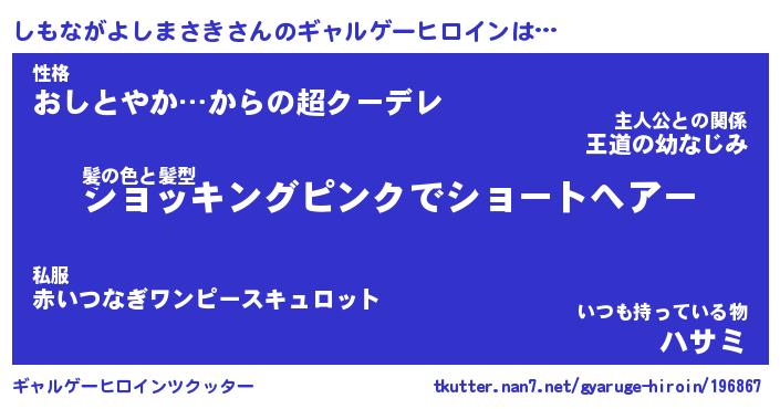 | 女子向けラノベタイトル風あだ名 | 『(仮)しもながよしまさきのやんごとなき事情』 |