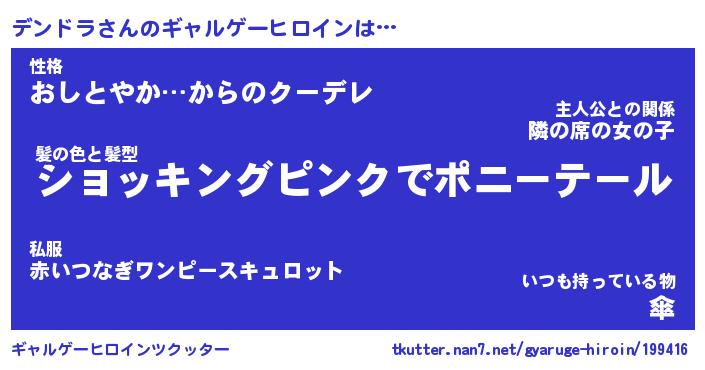 | 女子向けラノベタイトル風あだ名 | 『(仮)デンドラのやんごとなき事情』 |