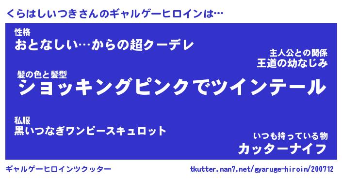 | 女子向けラノベタイトル風あだ名 | 『(仮)くらはしいつきのやんごとなき事情』 |