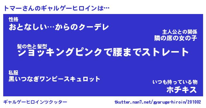 | 女子向けラノベタイトル風あだ名 | 『(仮)トマーのやんごとなき事情』 |