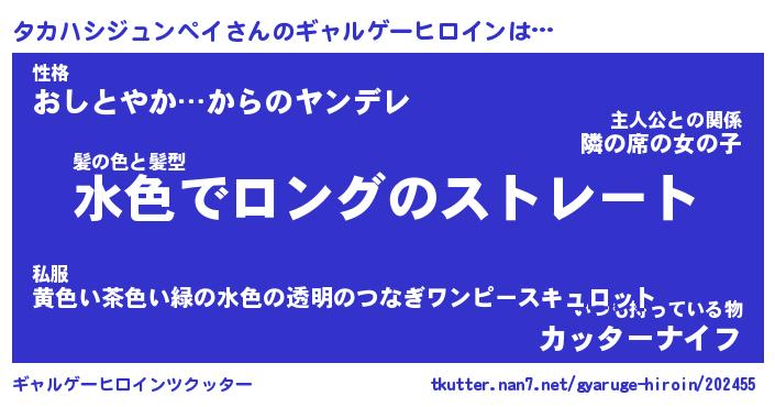 | 女子向けラノベタイトル風あだ名 | 『(仮)タカハシジュンペイのやんごとなき事情』 |
