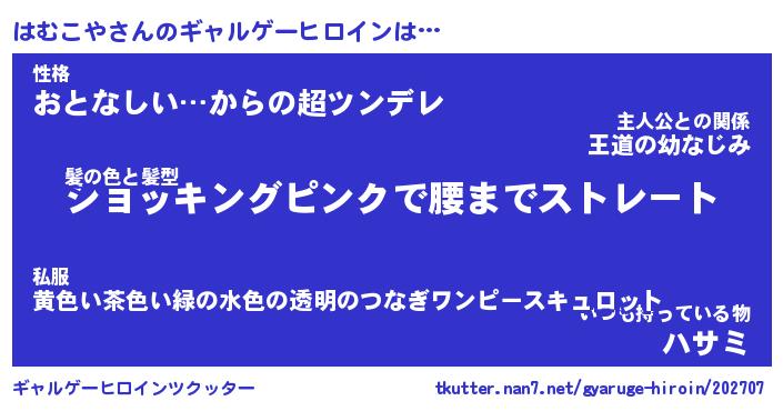 | 女子向けラノベタイトル風あだ名 | 『(仮)はむこやのやんごとなき事情』 |