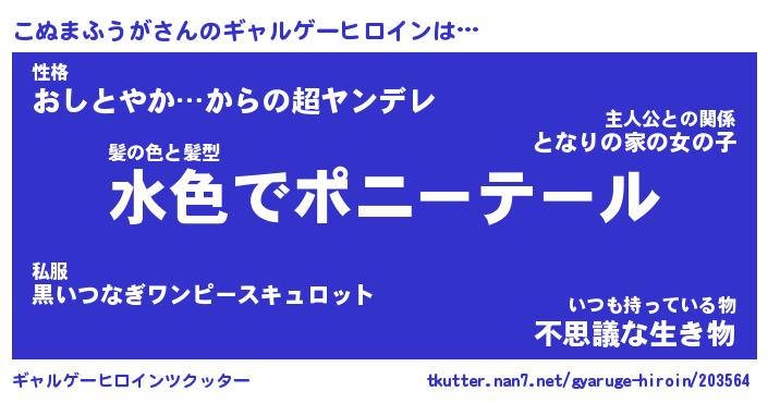 | 女子向けラノベタイトル風あだ名 | 『(仮)こぬまふうがのやんごとなき事情』 |