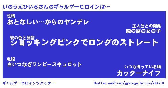 | 男性向けラノベタイトル風あだ名 | 『いのうえひいろの憂鬱』 |