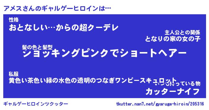 | 女子向けラノベタイトル風あだ名 | 『(仮)アメスのやんごとなき事情』 |