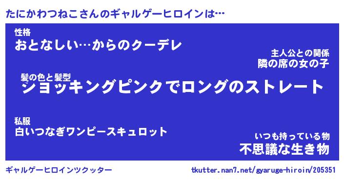 | 男性向けラノベタイトル風あだ名 | 『たにかわつねこの憂鬱』 |