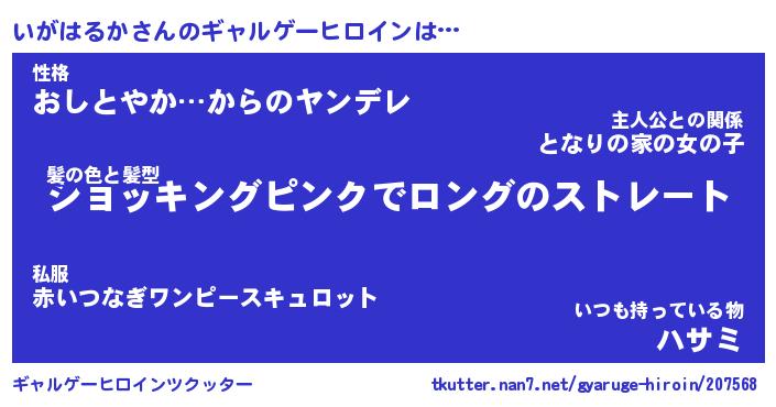 | 女子向けラノベタイトル風あだ名 | 『(仮)いがはるかのやんごとなき事情』 |