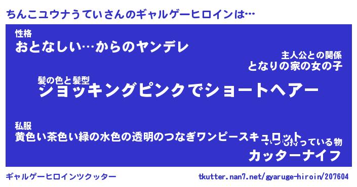 | 男性向けラノベタイトル風あだ名 | 『ちんこユウナうていの憂鬱』 |