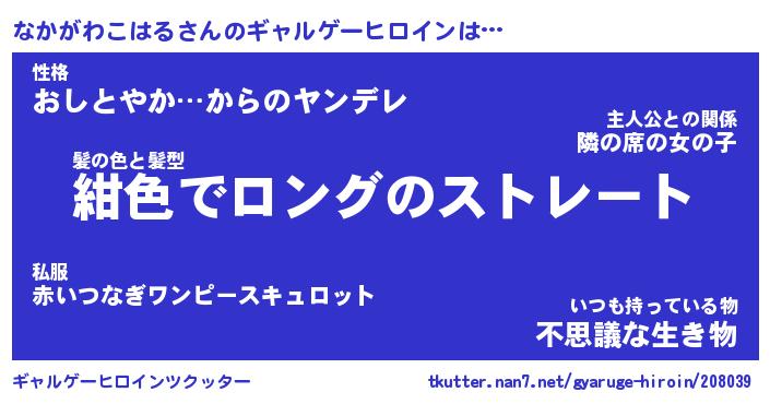| 男性向けラノベタイトル風あだ名 | 『ナカガワコハルアートオンライン』 |