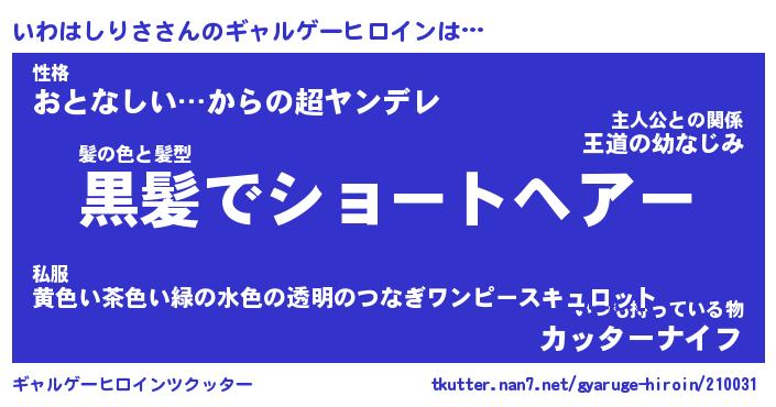 | 女子向けラノベタイトル風あだ名 | 『(仮)いわはしりさのやんごとなき事情』 |