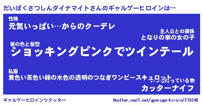 | 男性向けラノベタイトル風あだ名 | 『だいばくさつしんダイナマイトの憂鬱』 |