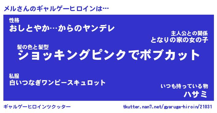 | 男性向けラノベタイトル風あだ名 | 『メルの憂鬱』 |