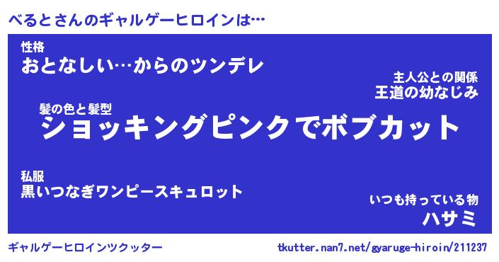 | 男性向けラノベタイトル風あだ名 | 『べるとの憂鬱』 |