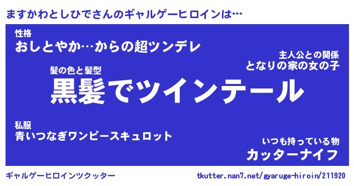 | 女子向けラノベタイトル風あだ名 | 『(仮)ますかわとしひでのやんごとなき事情』 |