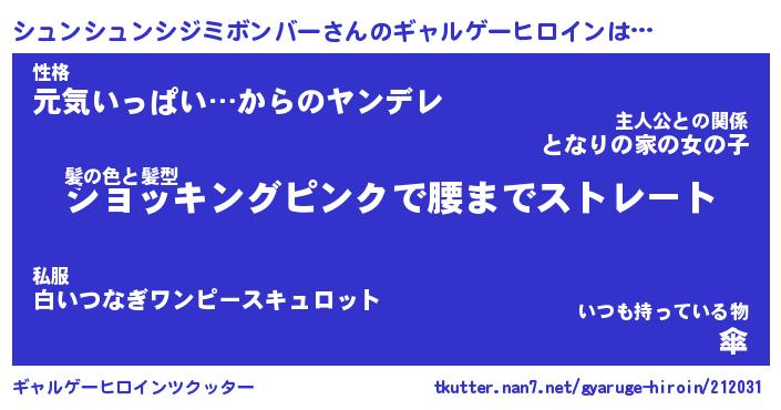 | 女子向けラノベタイトル風あだ名 | 『(仮)シュンシュンシジミボンバーのやんごとなき事情』 |