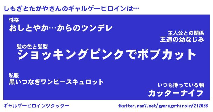 | 女子向けラノベタイトル風あだ名 | 『(仮)しもざとたかやのやんごとなき事情』 |