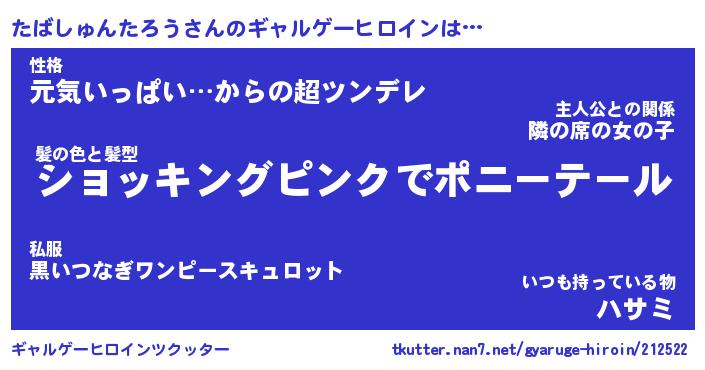 | 男性向けラノベタイトル風あだ名 | 『たばしゅんたろうの憂鬱』 |