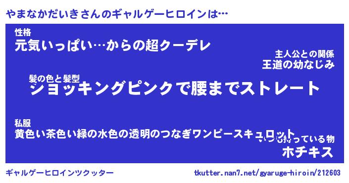 | 女子向けラノベタイトル風あだ名 | 『(仮)やまなかだいきのやんごとなき事情』 |
