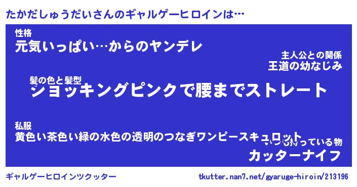 | 女子向けラノベタイトル風あだ名 | 『(仮)たかだしゅうだいのやんごとなき事情』 |