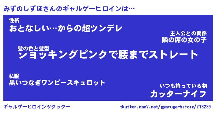 | ヒーロー風カッコイイあだ名 | 『スーパーミズノシズホ』『天弓騎士ミズ』 |