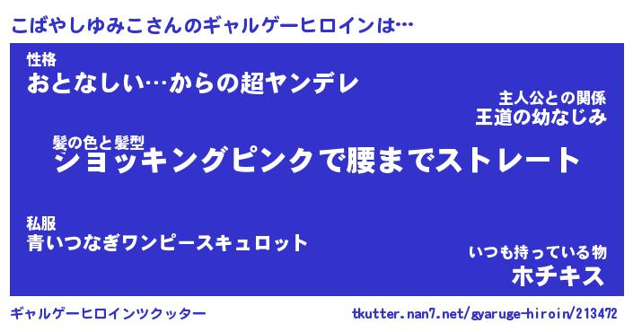 | 女子向けラノベタイトル風あだ名 | 『(仮)こばやしゆみこのやんごとなき事情』 |