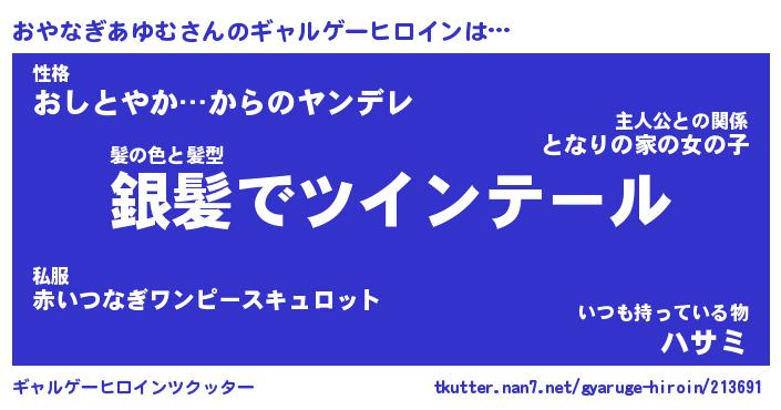 | 男性向けラノベタイトル風あだ名 | 『オヤナギアユムアートオンライン』 |