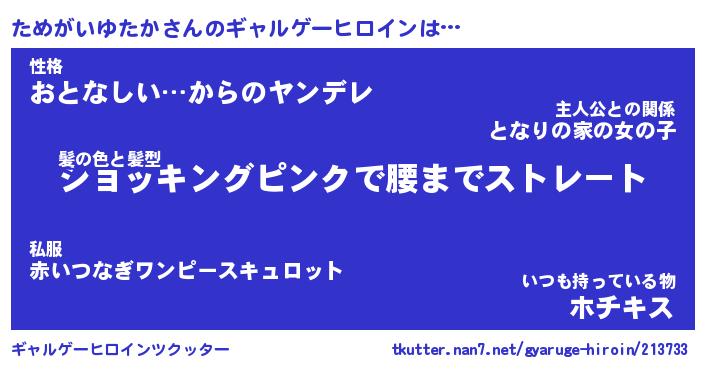 | 女子向けラノベタイトル風あだ名 | 『(仮)ためがいゆたかのやんごとなき事情』 |