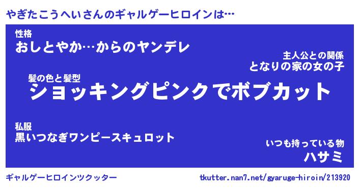 | 女子向けラノベタイトル風あだ名 | 『(仮)やぎたこうへいのやんごとなき事情』 |
