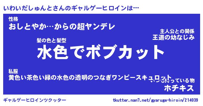 | 女子向けラノベタイトル風あだ名 | 『(仮)いわいだしゅんとのやんごとなき事情』 |