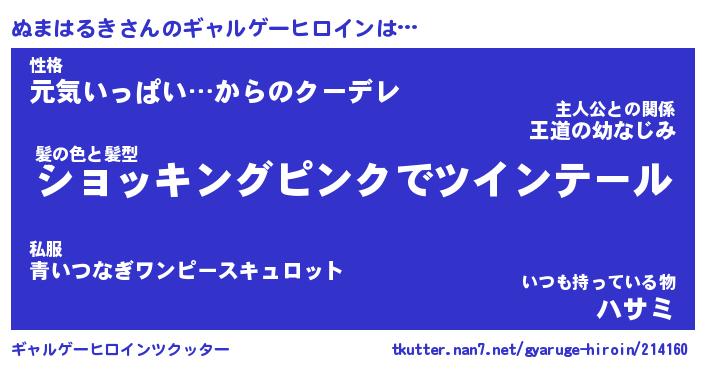 | 女子向けラノベタイトル風あだ名 | 『(仮)ぬまはるきのやんごとなき事情』 |