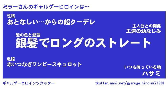 | 男性向けラノベタイトル風あだ名 | 『ミラーの憂鬱』 |