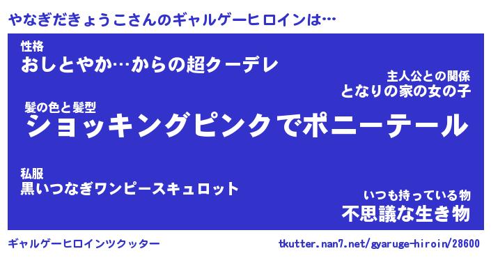 | 女子向けラノベタイトル風あだ名 | 『(仮)やなぎだきょうこのやんごとなき事情』 |