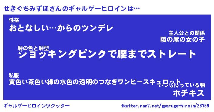 | 女子向けラノベタイトル風あだ名 | 『(仮)せきぐちみずほのやんごとなき事情』 |