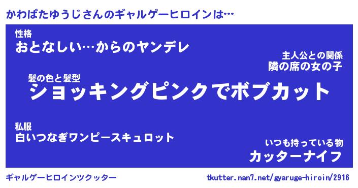 | 男性向けラノベタイトル風あだ名 | 『かわばたゆうじの憂鬱』 |