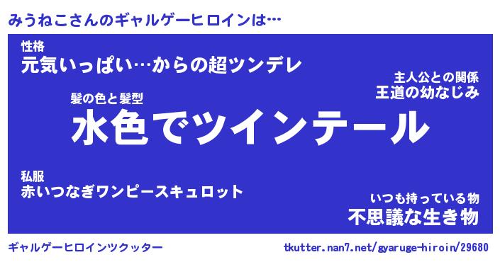 | 女子向けラノベタイトル風あだ名 | 『(仮)みうねこのやんごとなき事情』 |